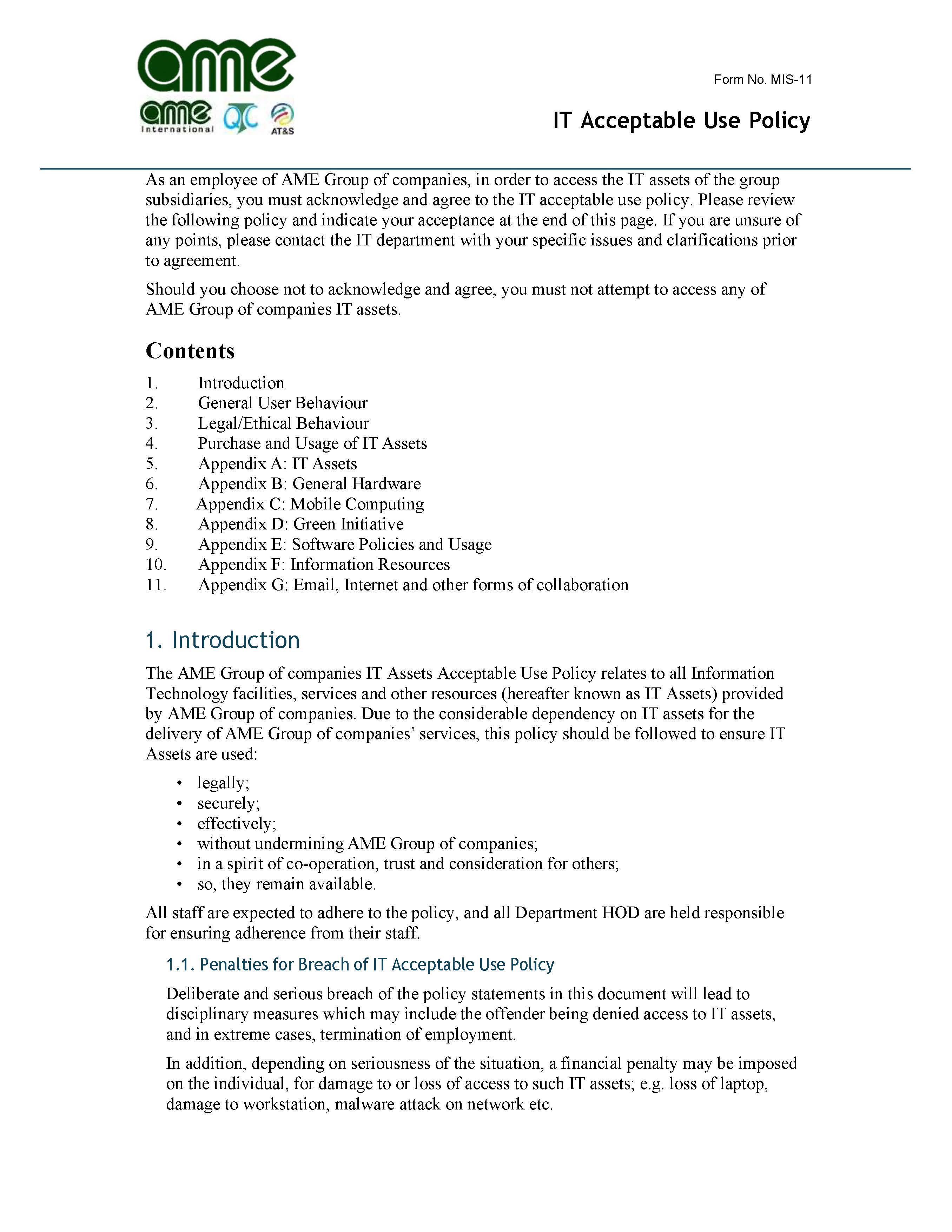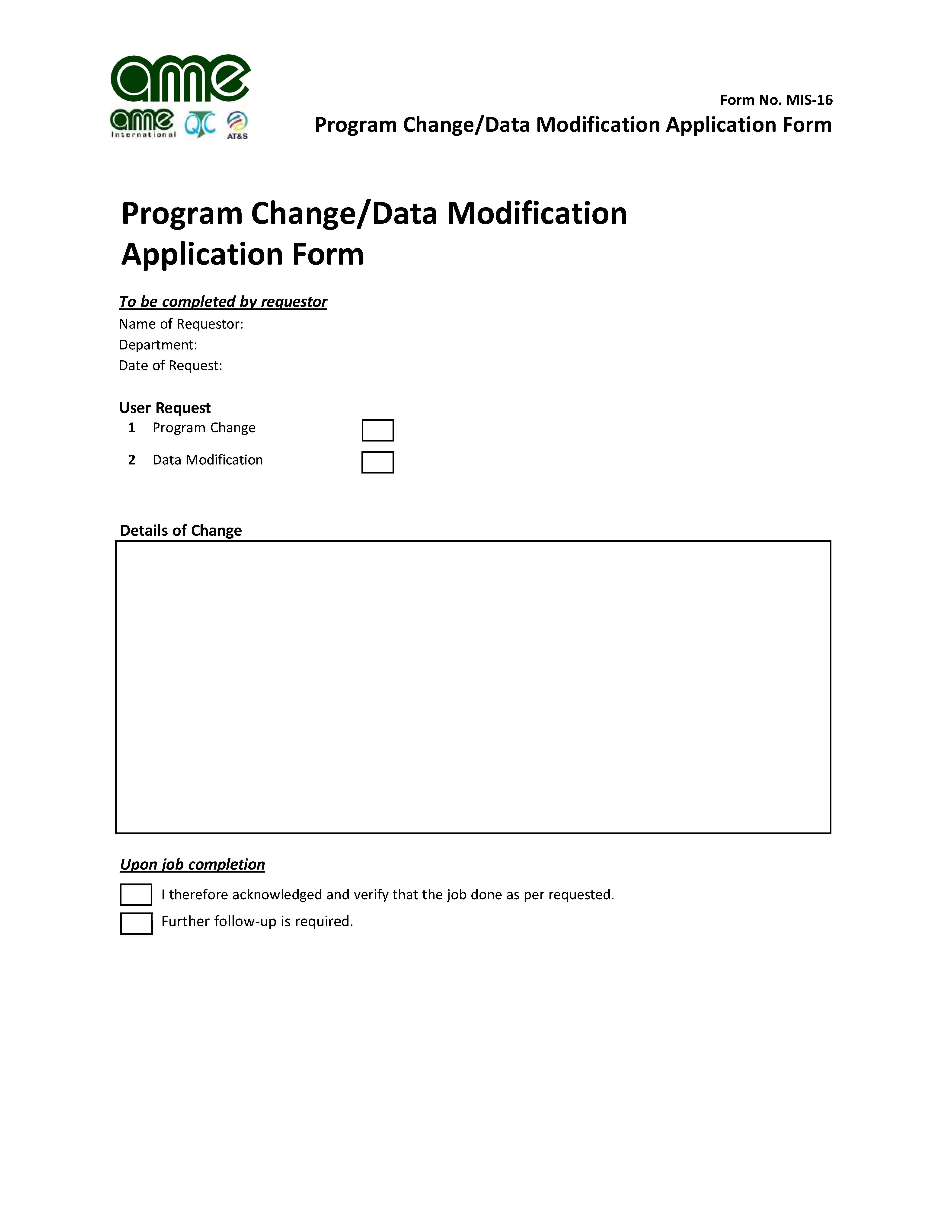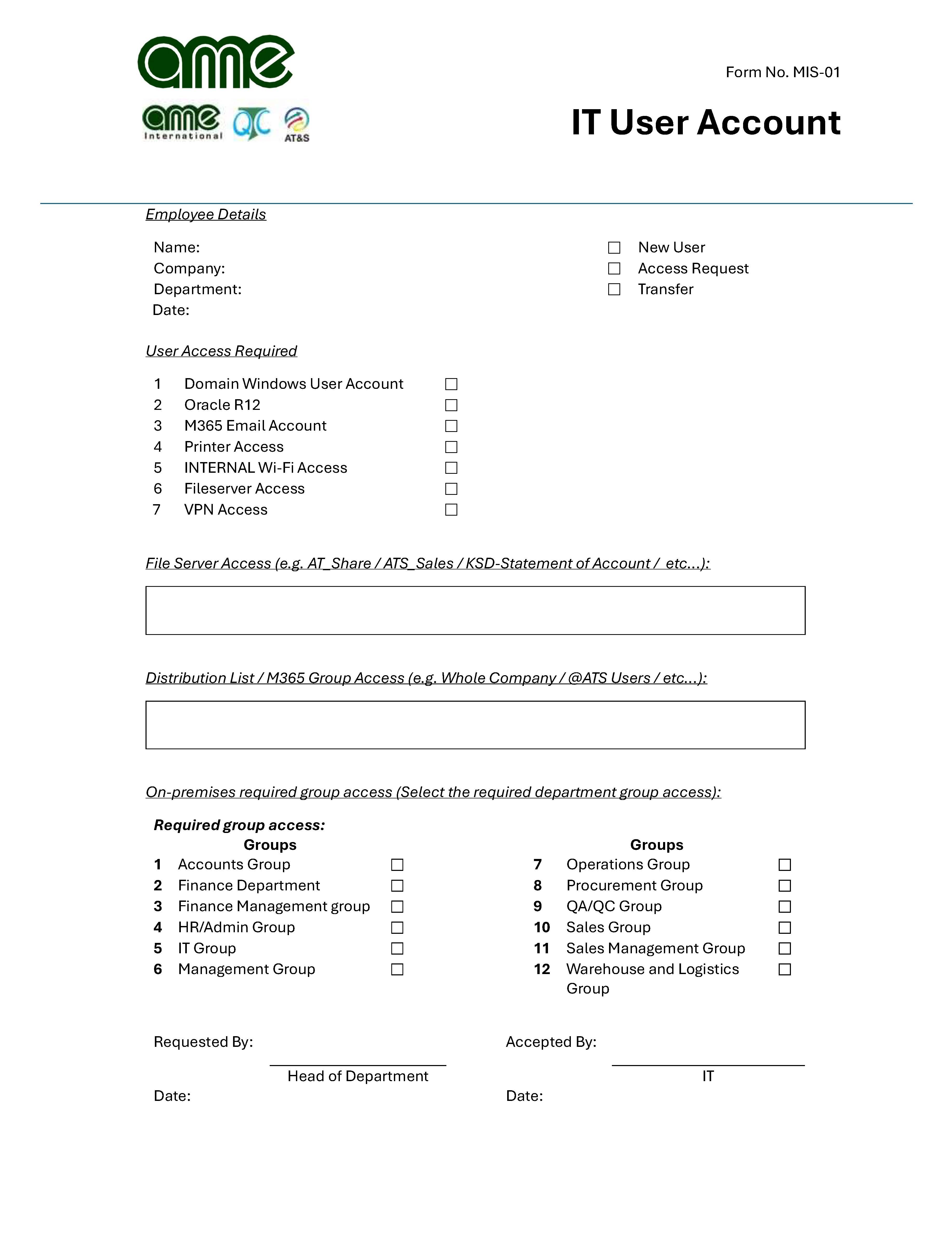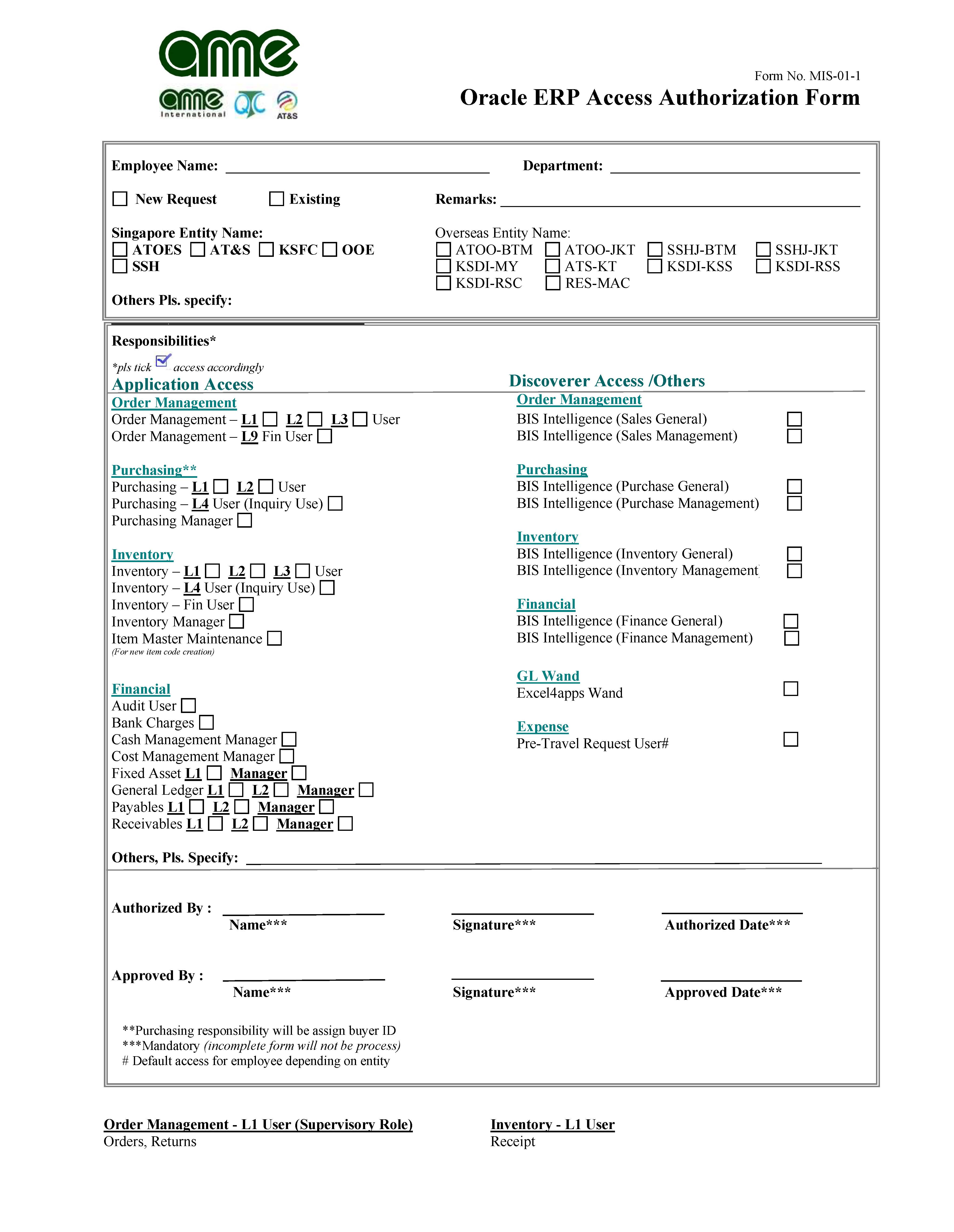 FORMS (IT RELATED FORMS) MIS-01 IT User Account Form MIS-01-1 Oracle ERP Access Authorization Form MIS-11 IT Acceptable Use Policy MIS-16 Application Form for Program Change or Data Modification MIS-17 – Incident Report for Damaged Equipment