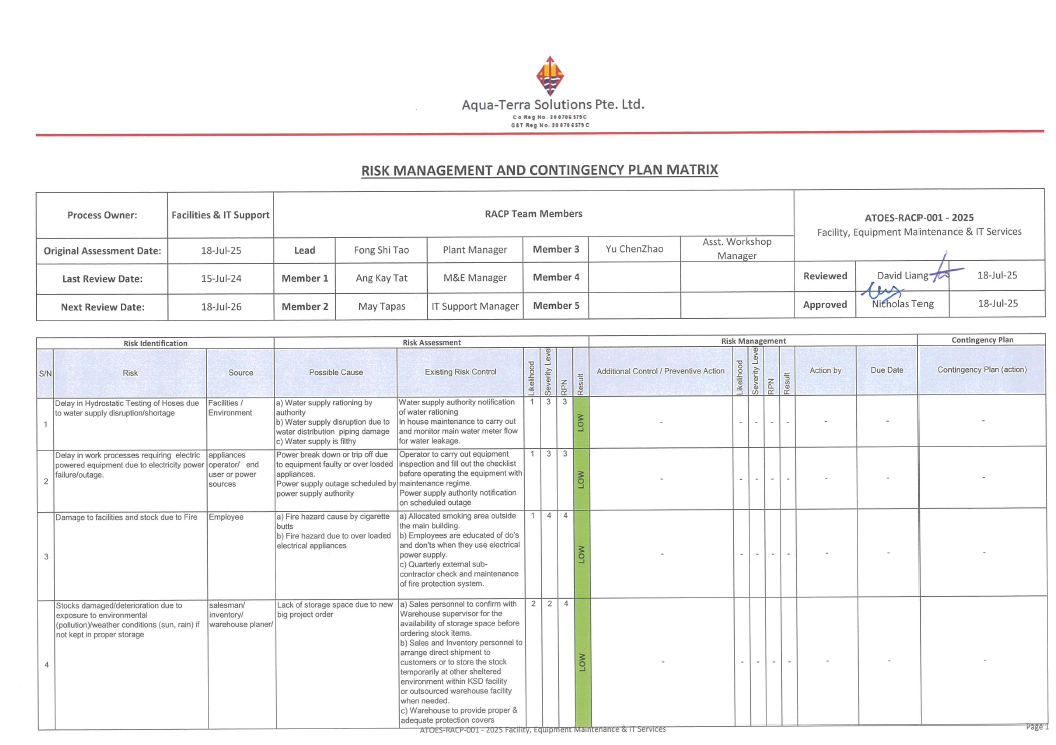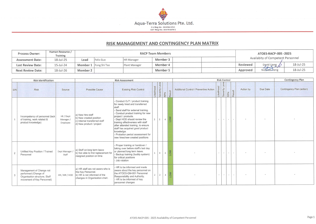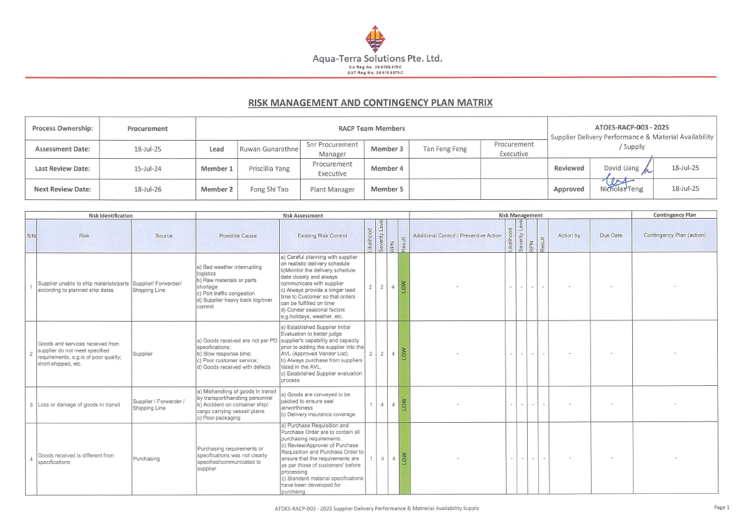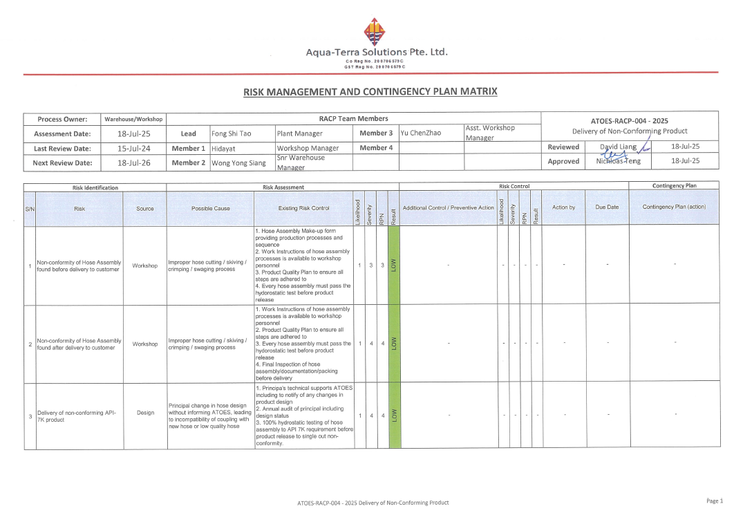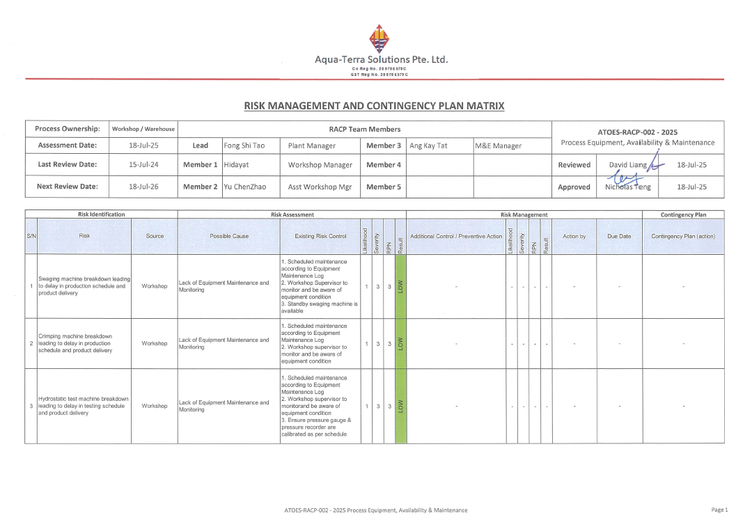 ATOES-RACP-0012025 Facility Equipment Maintenance & IT Service ATOES-RACP-0022025 Process Equipment, Availability & Maintenance ATOES-RACP-0032025 Supplier Delivery Performance & Matrerial Availability Supply ATOES-RACP-0042025 Delivery of Non-Conforming Product ATOES-RACP-0052025 Availability of Competent Personnel
